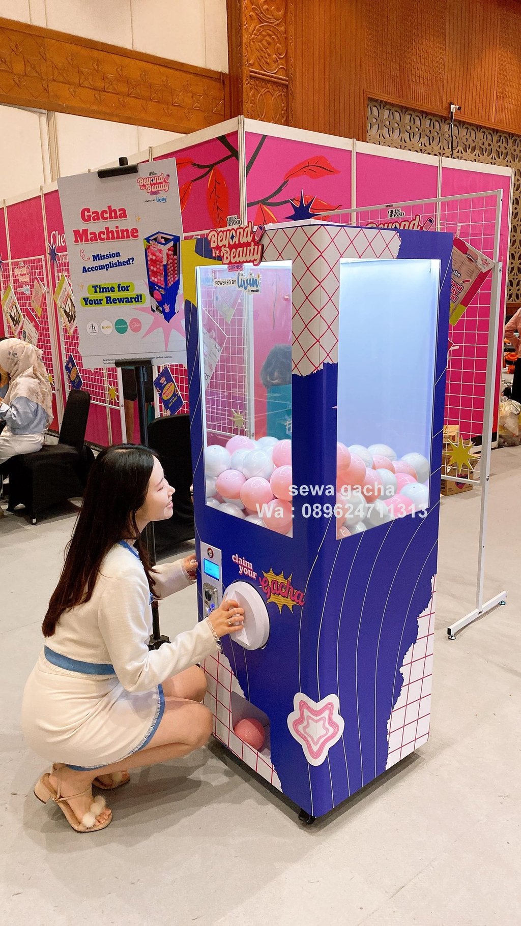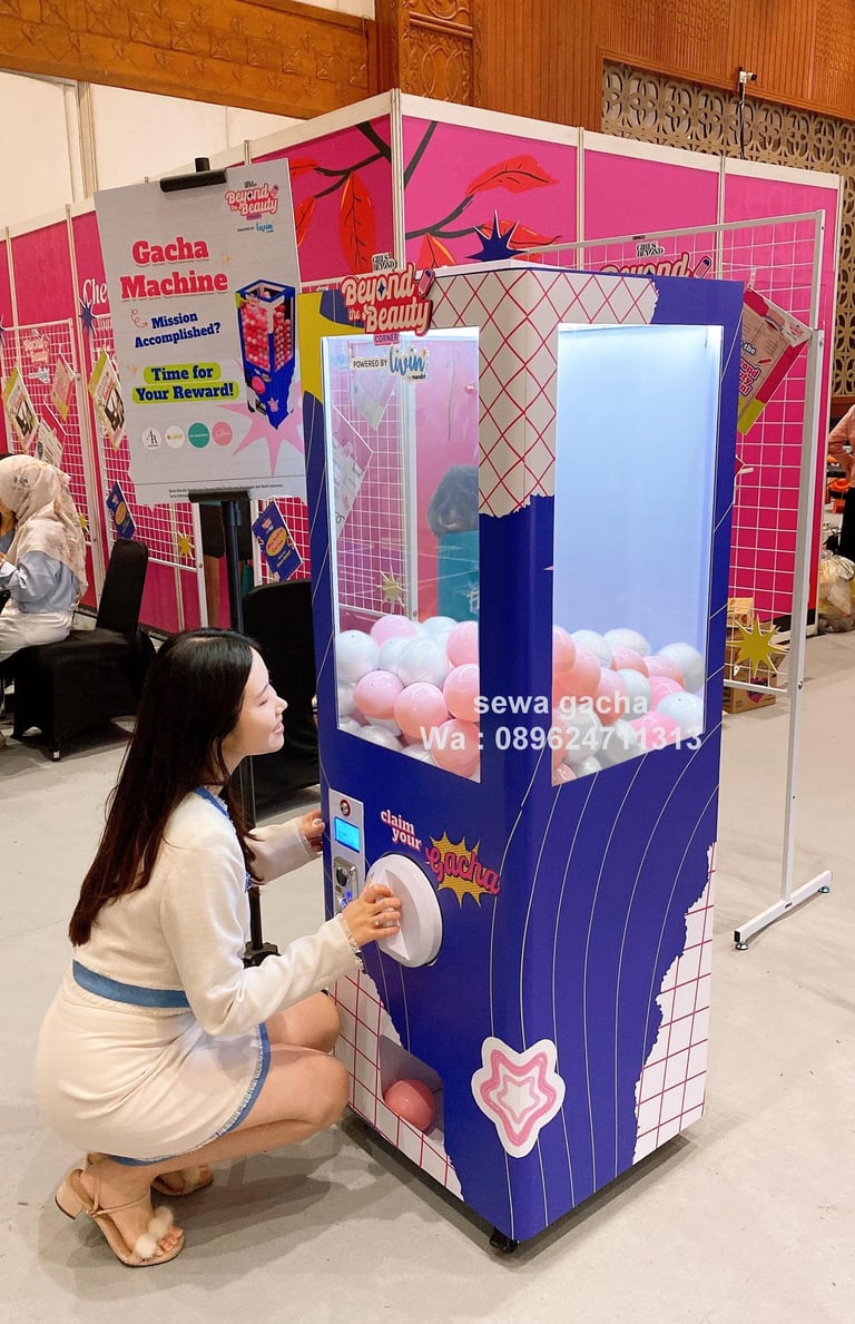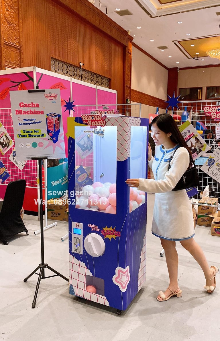 Mesin ini dapat dikustomisasi secara penuh — mulai dari warna, visual branding, hingga desain stiker — sehingga tampilannya selaras dengan identitas brand kecantikan yang elegan, modern, maupun playful. Pada acara Beyond the Beauty, mesin ini dikustomisasi penuh dengan warna dominan biru, putih, pink, serta kuning yang memberikan kesan yang playful dan pop, dilengkapi dengan bola gacha berwarna putih dan pink yang selaras dengan event yang bertemakan beauty.