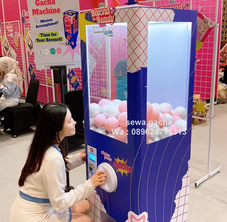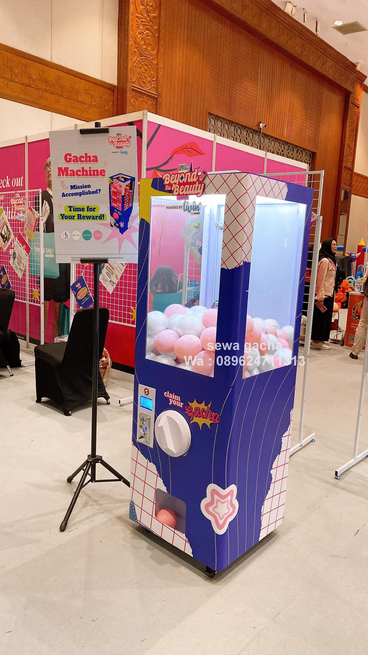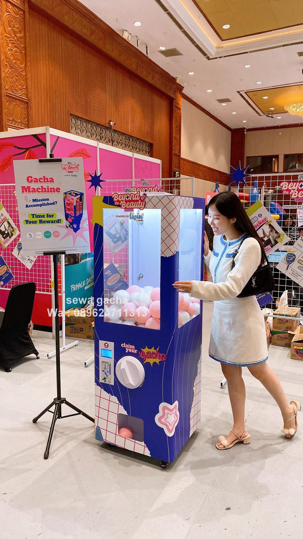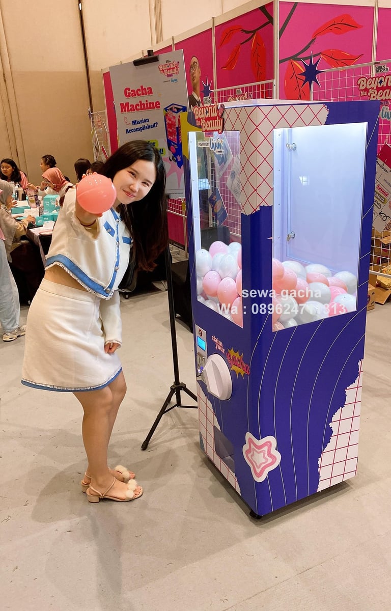 Mesin ini dapat dikustomisasi secara penuh — mulai dari warna, visual branding, hingga desain stiker — sehingga tampilannya selaras dengan identitas brand kecantikan yang elegan, modern, maupun playful. Pada acara Beyond the Beauty, mesin ini dikustomisasi penuh dengan warna dominan biru, putih, pink, serta kuning yang memberikan kesan yang playful dan pop, dilengkapi dengan bola gacha berwarna putih dan pink yang selaras dengan event yang bertemakan beauty.