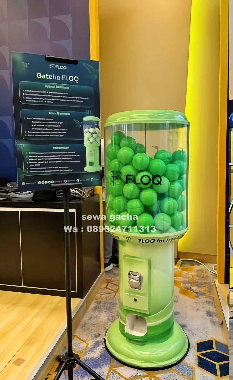 Mesin gacha yang digunakan FLOQ tampil eye-catching dengan desain yang modern dan sesuai dengan identitas brand, didominasi dengan warna hijau. Ukurannya yang proporsional membuatnya mudah dilihat dari berbagai sudut booth, sementara estetika visual yang clean dan futuristic sejalan dengan citra brand FLOQ yang inovatif. Mesin ini tidak hanya menarik perhatian pengunjung, tetapi juga mengundang mereka untuk mencoba pengalaman baru yang menyenangkan dan interaktif.