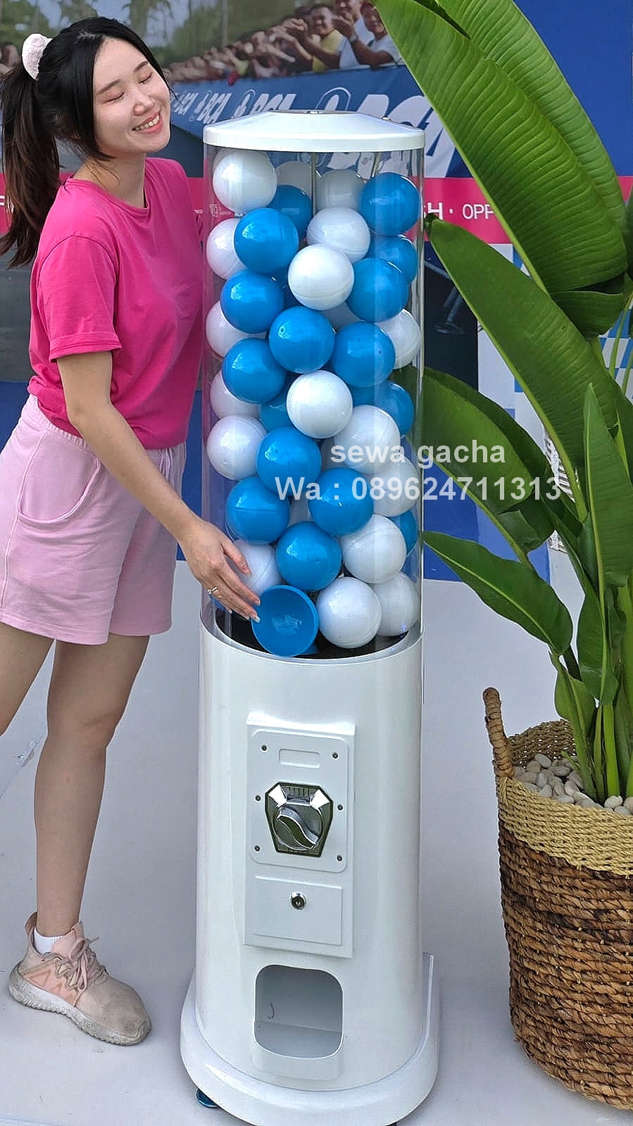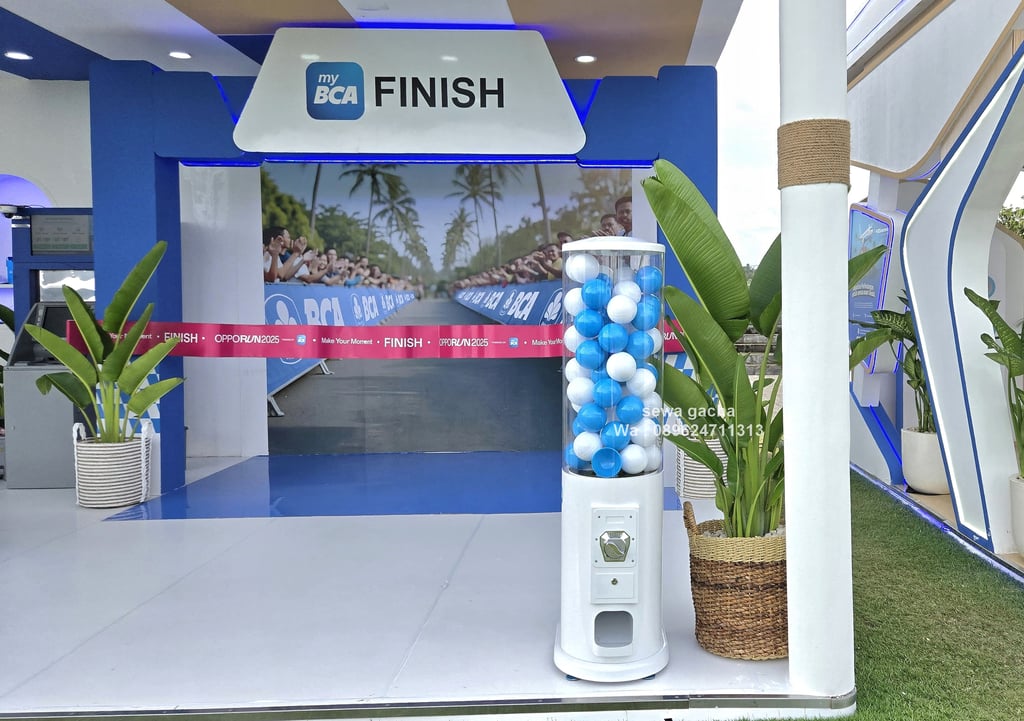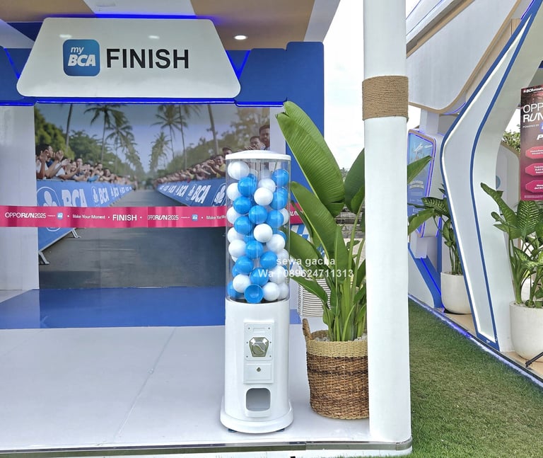Pada Oppo Run Bali 2025, mesin ini dikustomisasi dengan bola-bola gacha berwarna biru dan putih khas BCA. Simple namun modern serta memberikan kesan yang sporty, small Gacha ini sangat cocok untuk Acara Oppo Run yang berlokasi di Bali dan menjadi elemn yang memberikan kesan playful serta mampu menghidupkan suasana booth