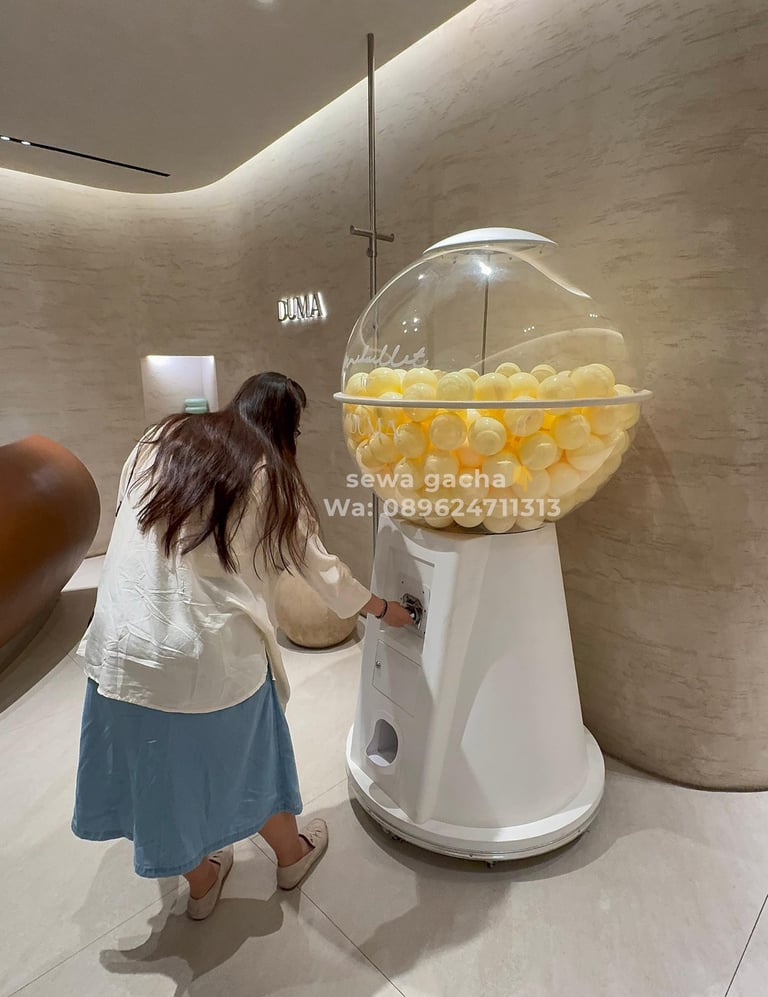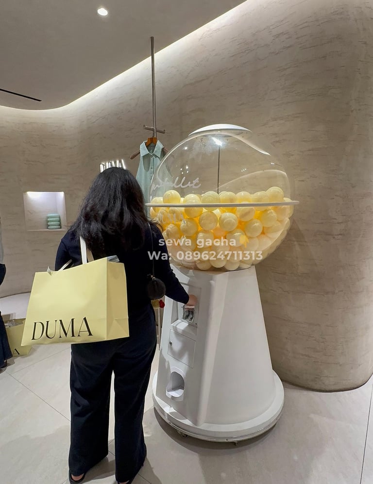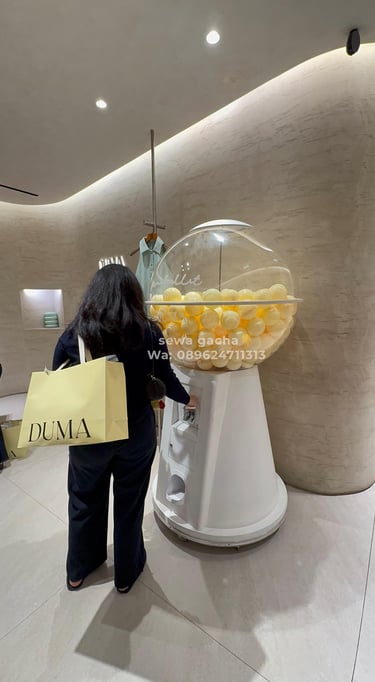 Pada booth Mmehuillet x Duma, mesin gacha ini didominasi oleh bola gacha berwarna kuning cerah yang berpadu dengan body mesin berwarna putih elegan. Perpaduan warna ini memberikan kesan mahal, classy, sekaligus modern, sangat sesuai dengan branding acara yang digelar di Plaza Indonesia.