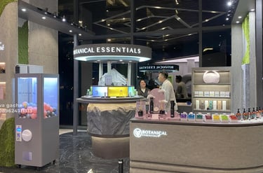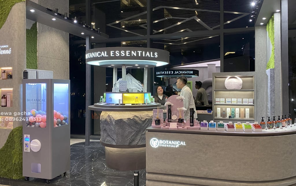 Konsep booth Botanical Essentials mengusung tema nature dengan aksesoris bebatuan dan rumput-rumputan, menghadirkan nuansa alami yang elegan. Untuk memperkuat kesan interaktif, dipilihlah mesin gacha Jumbo Square dengan dominasi bola gacha berwarna pink dan silver yang kontras namun tetap harmonis dengan atmosfer booth.
