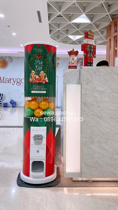 Berbeda dari konsep gift redemption biasa, mesin gacha hadir dengan tampilan yang dikustomisasi khusus untuk tema Natal. Desain mesin dipenuhi nuansa hijau, merah, dan aksen festive khas Natal, dipadukan dengan bola gacha berwarna cerah yang langsung menarik perhatian pengunjung.