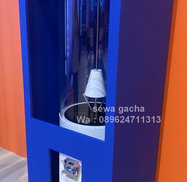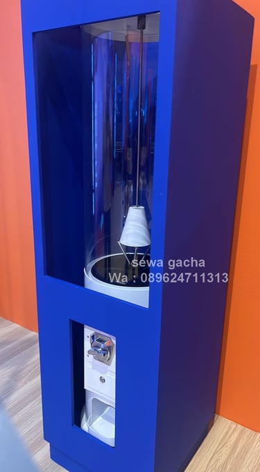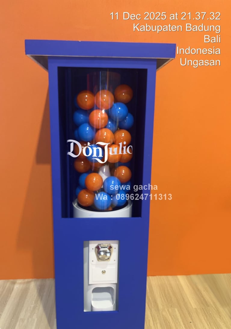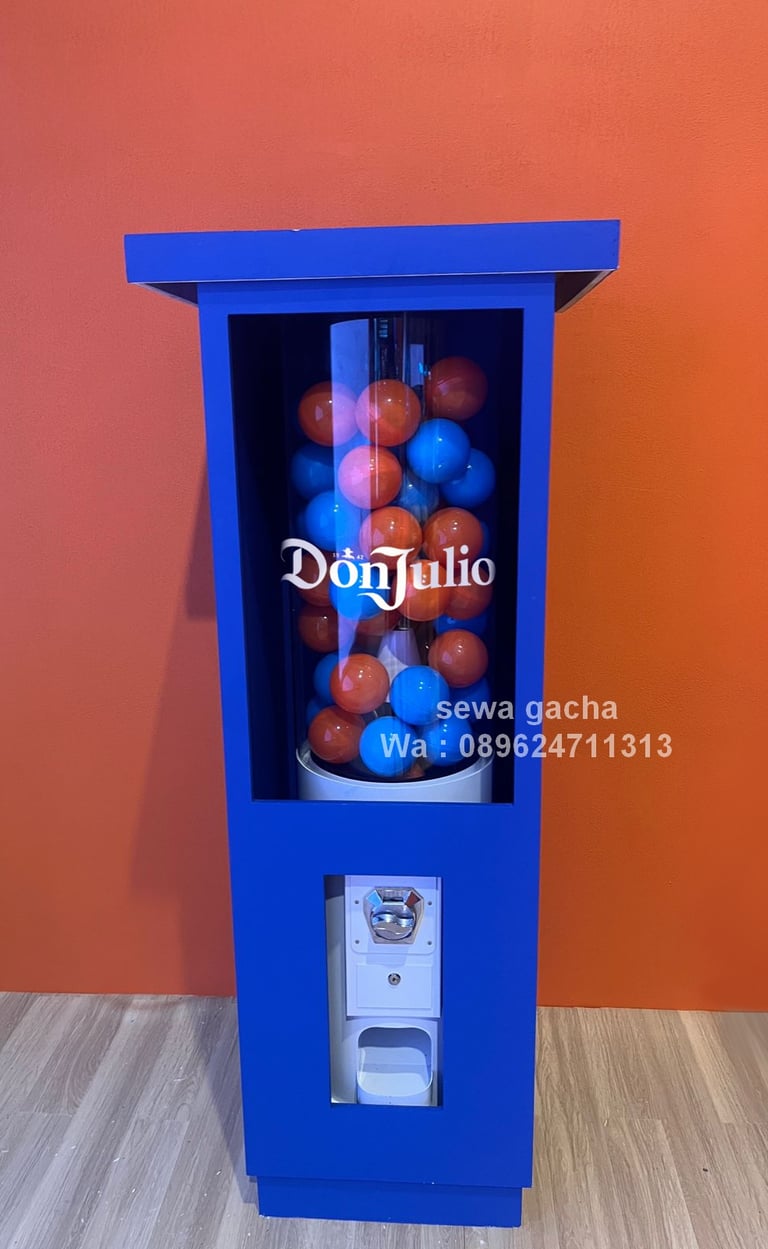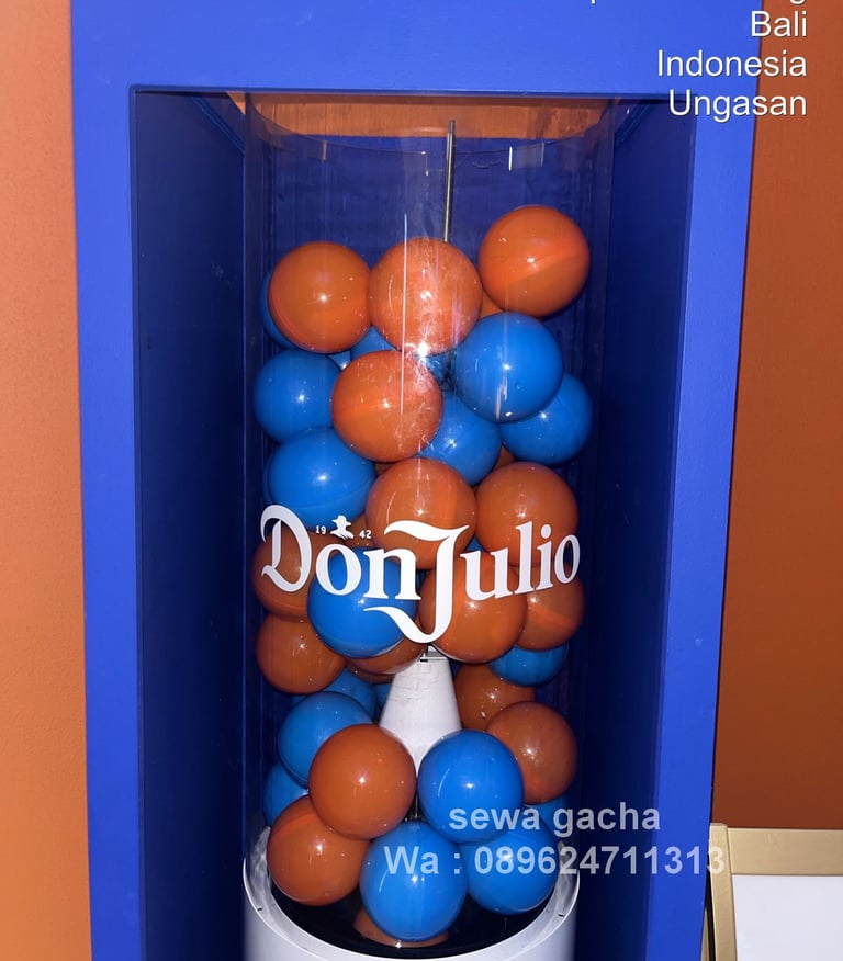 Mesin gacha dikustomisasi secara penuh dari 0 menyesuaikan dengan tema booth Don Julio di Acara DWP tahun ini yang didominasi warna biru dan oranye :